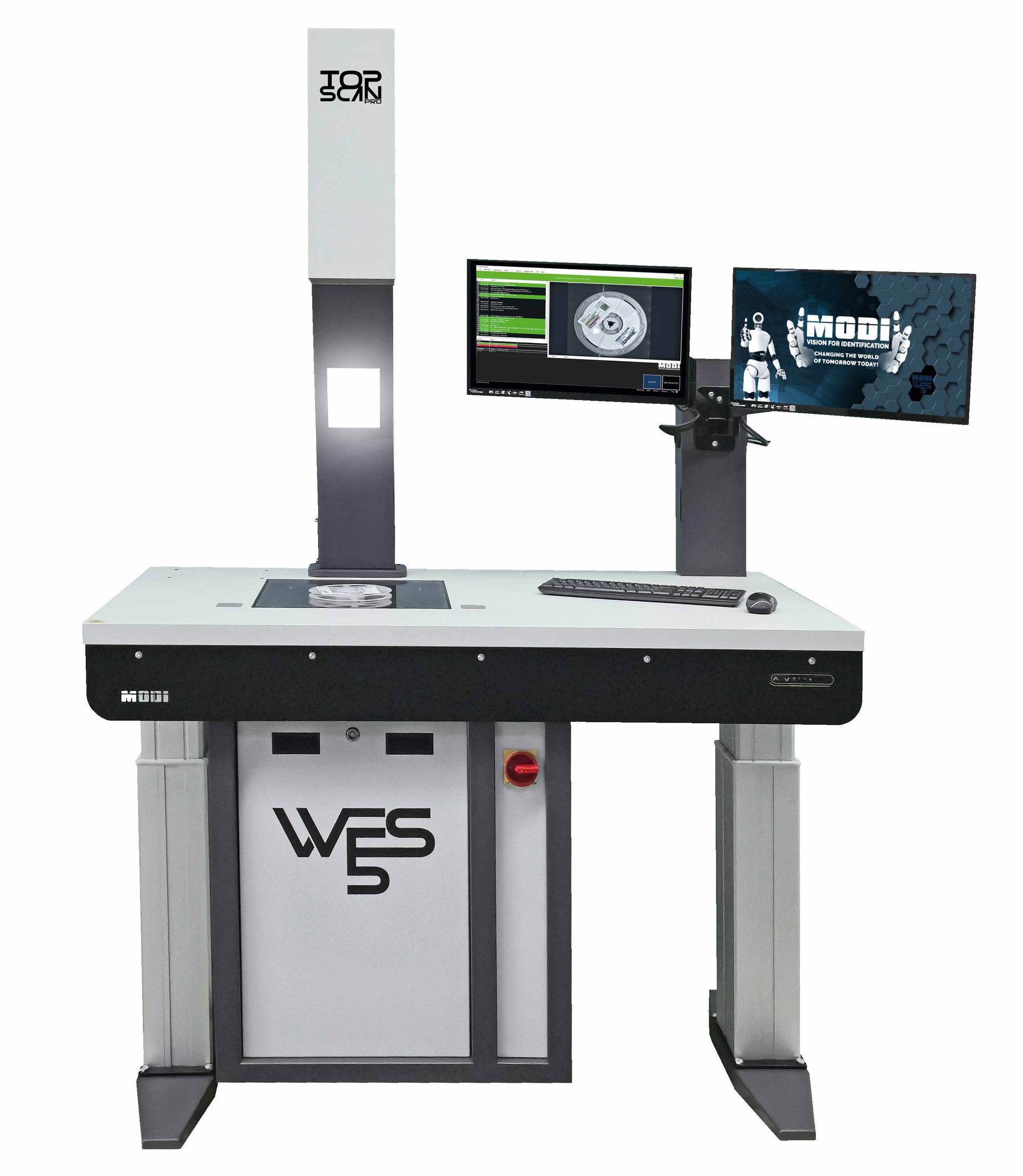 Optional erweitert der TopScan Pro seine Leistungsfähigkeit durch KI-basierte Klarschrifterkennung (OCR) sowie die Erfassung von Rollendicke und Durchmesser. Bei Einsatz als Add-on zum MODI WES V5 können sogar beide Seiten einer Bauteilrolle gleichzeitig erfasst werden. Die großzügige Scanfläche von 400 × 400 mm bietet dabei maximale Flexibilität im täglichen Einsatz. Das robuste, schlanke Gehäusedesign mit Standfuß und integrierter Beleuchtung macht den TopScan Pro zur idealen Lösung für moderne, leistungsorientierte Wareneingangsprozesse
