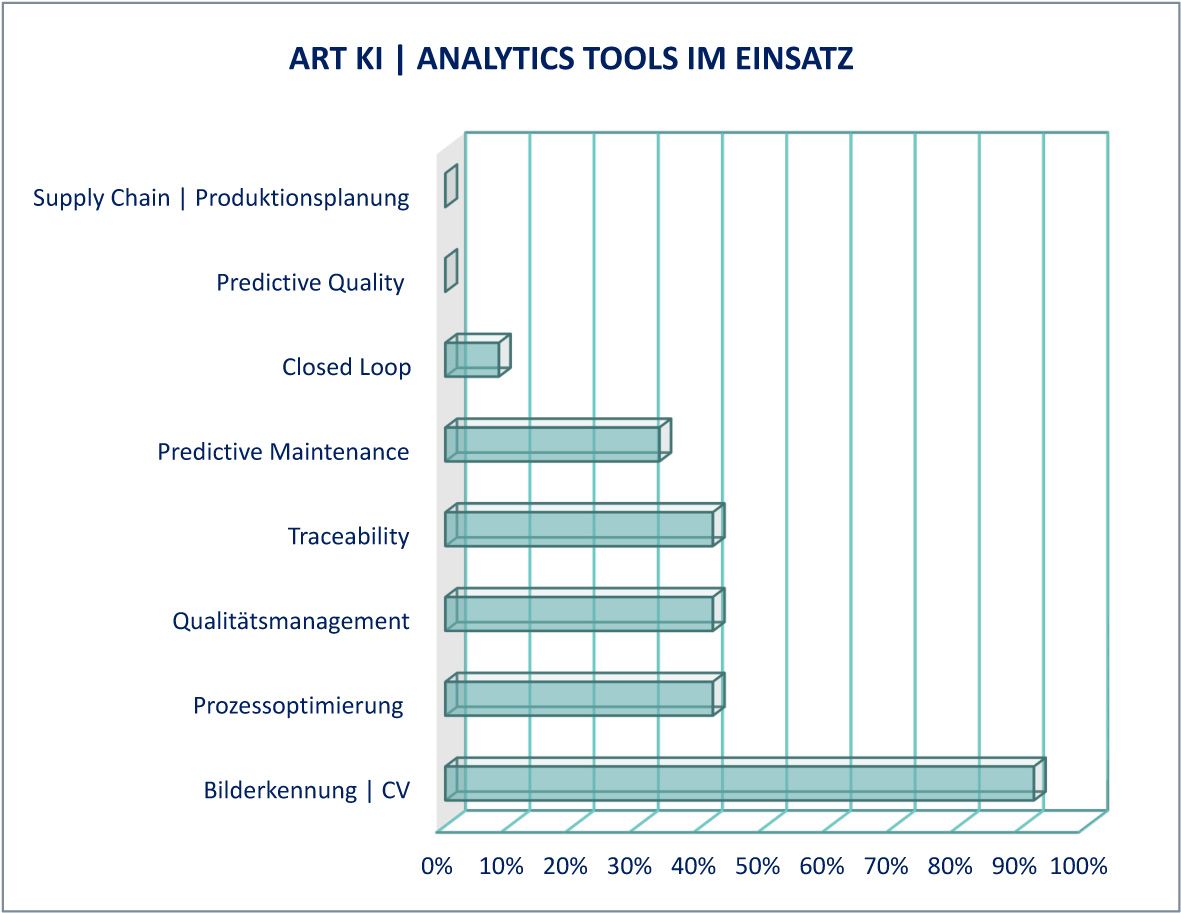 Fortgeschrittene Anwendungen wie Predictive Quality oder Supply-Chain-Optimierung kommen laut Umfrage noch in keinem der befragten Unternehmen praktisch zum Einsatz.